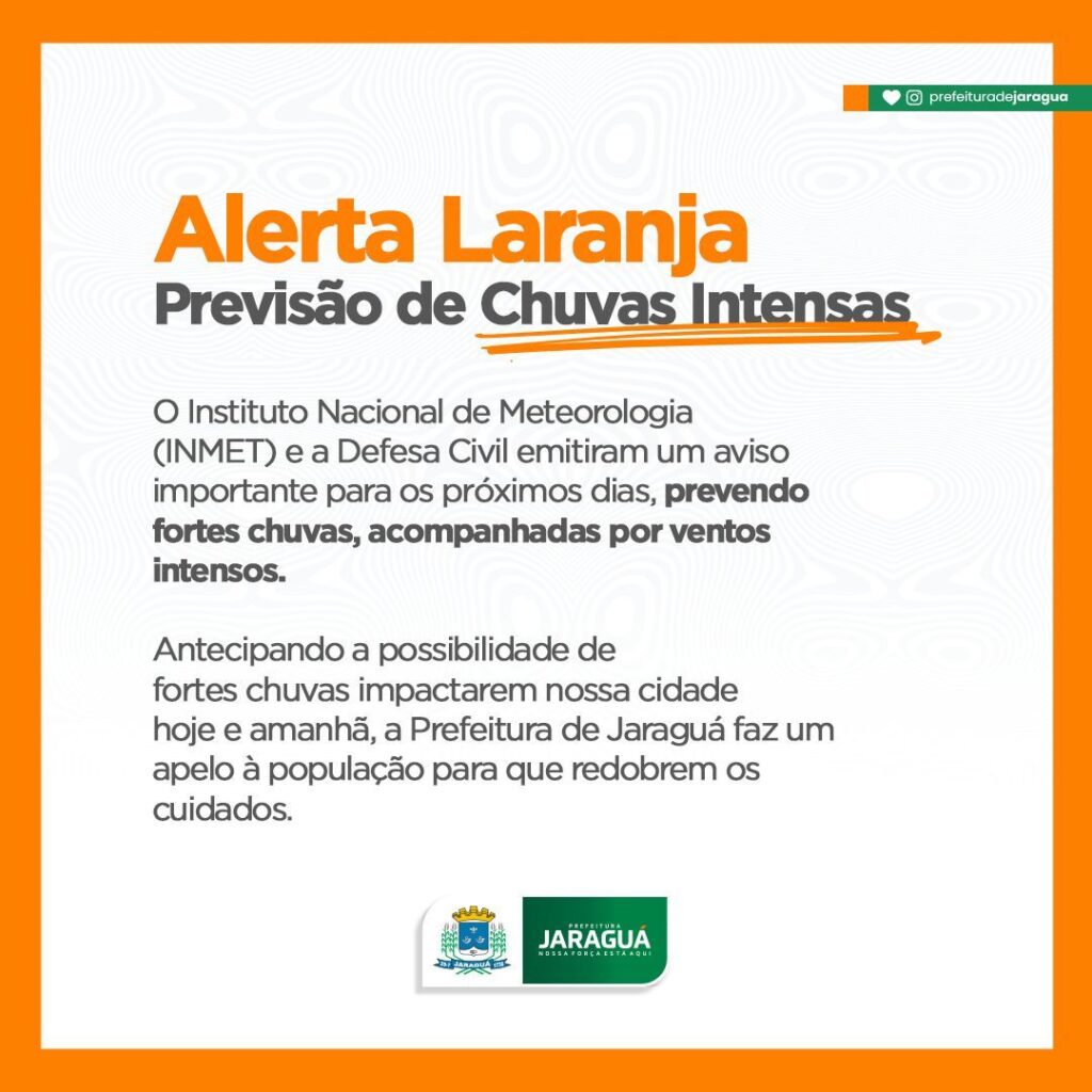 🌪💨 Estão previstas fortes chuvas acompanhadas por ventos fortes. Sabemos dos possíveis impactos e danos à nossa cidade, então, a Prefeitura de Jaraguá faz um apelo à população para que redobrem os cuidados. ✅