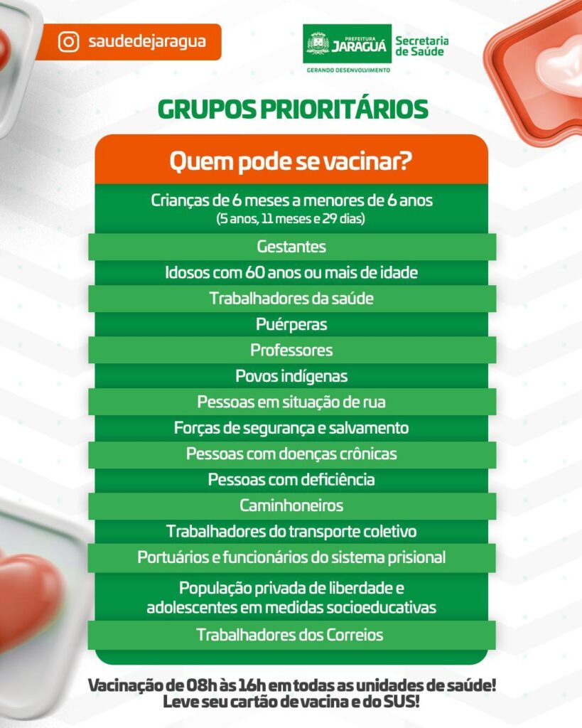 🔹 Se você faz parte dos grupos prioritários, não perca tempo! A gripe pode parecer inofensiva, mas pode trazer complicações sérias. 💪E olha, vacina boa é vacina no braço!