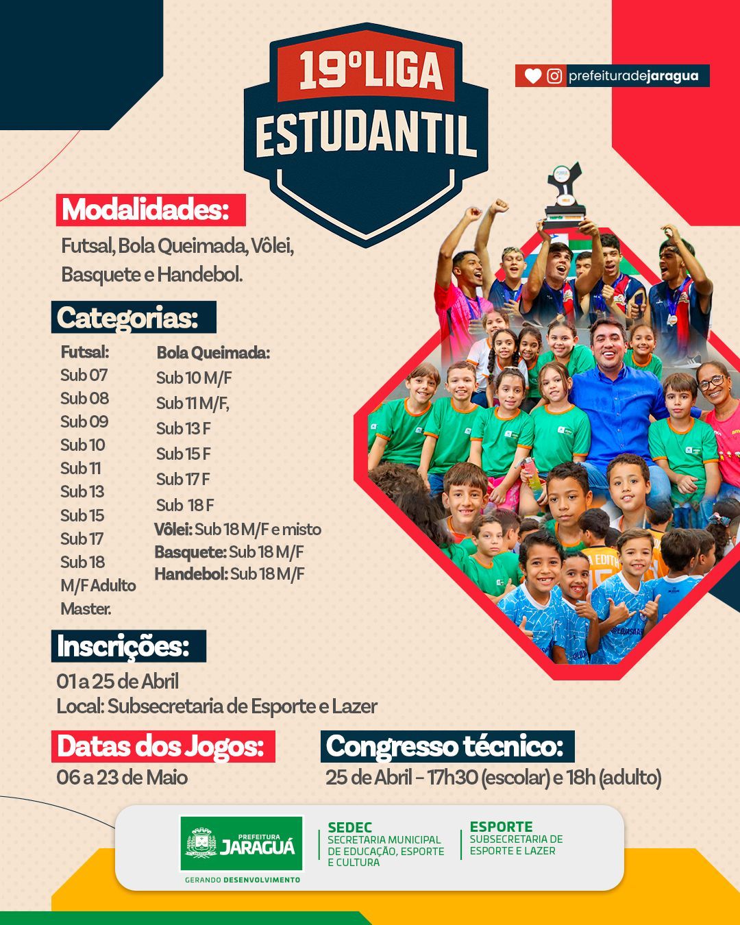 A 19ª Liga Estudantil está com inscrições abertas até 25 de abril na Subsecretaria de Esporte e Lazer. As modalidades incluem futsal, bola queimada, vôlei, basquete e handebol, com categorias do sub-07 ao adulto.