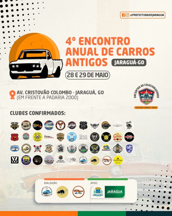 Nos próximos dia 28 e 29 de maio Jaraguá sediará o 4º Encontro Anual de Carros Antigos, um tradicional evento que está de volta ao nosso calendário anual de realizações, que neste ano contará com o apoio da Prefeitura de Jaraguá.