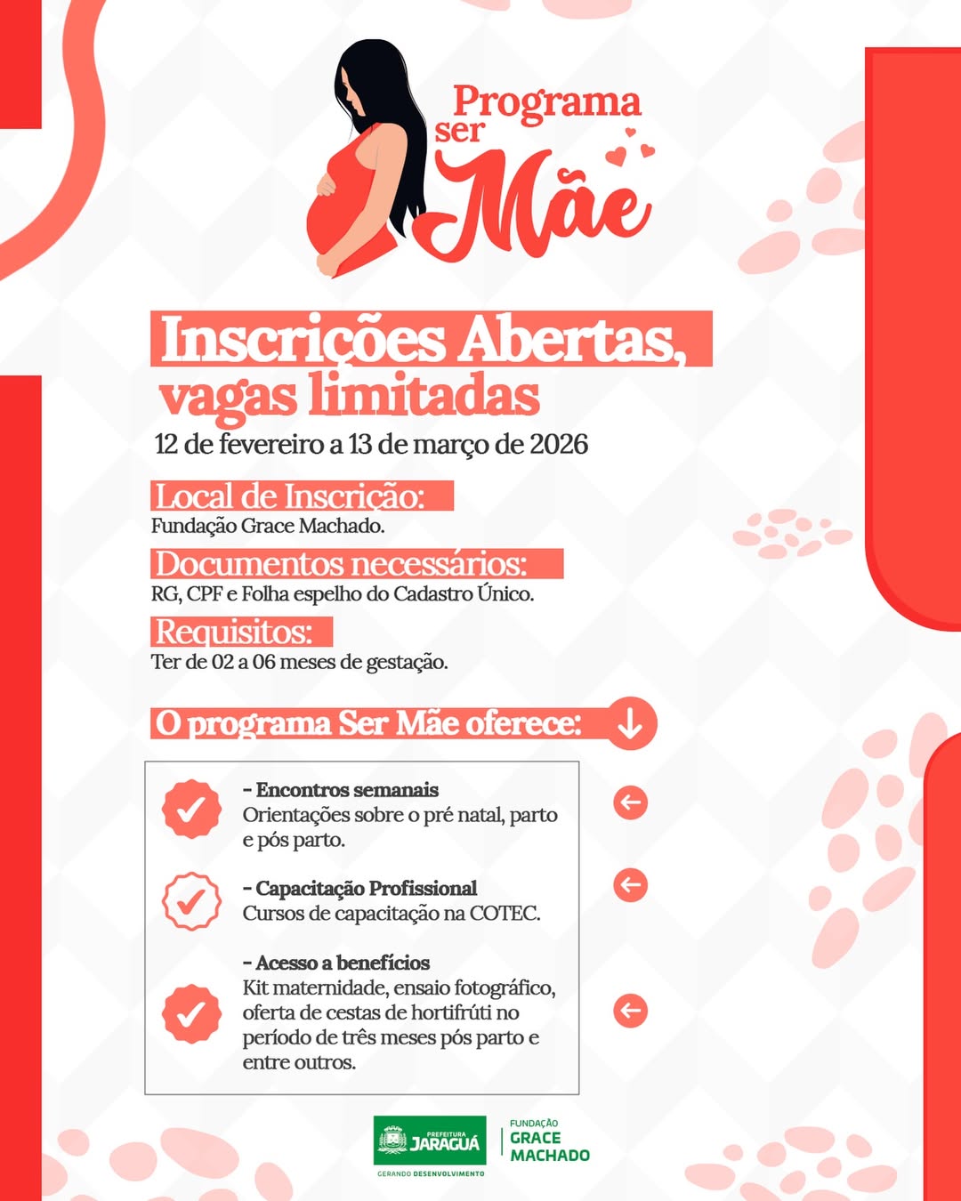 As inscrições acontecem de 12 de fevereiro a 13 de março, na Fundação Grace Machado, para gestantes de 2 a 6 meses, com vagas limitadas.