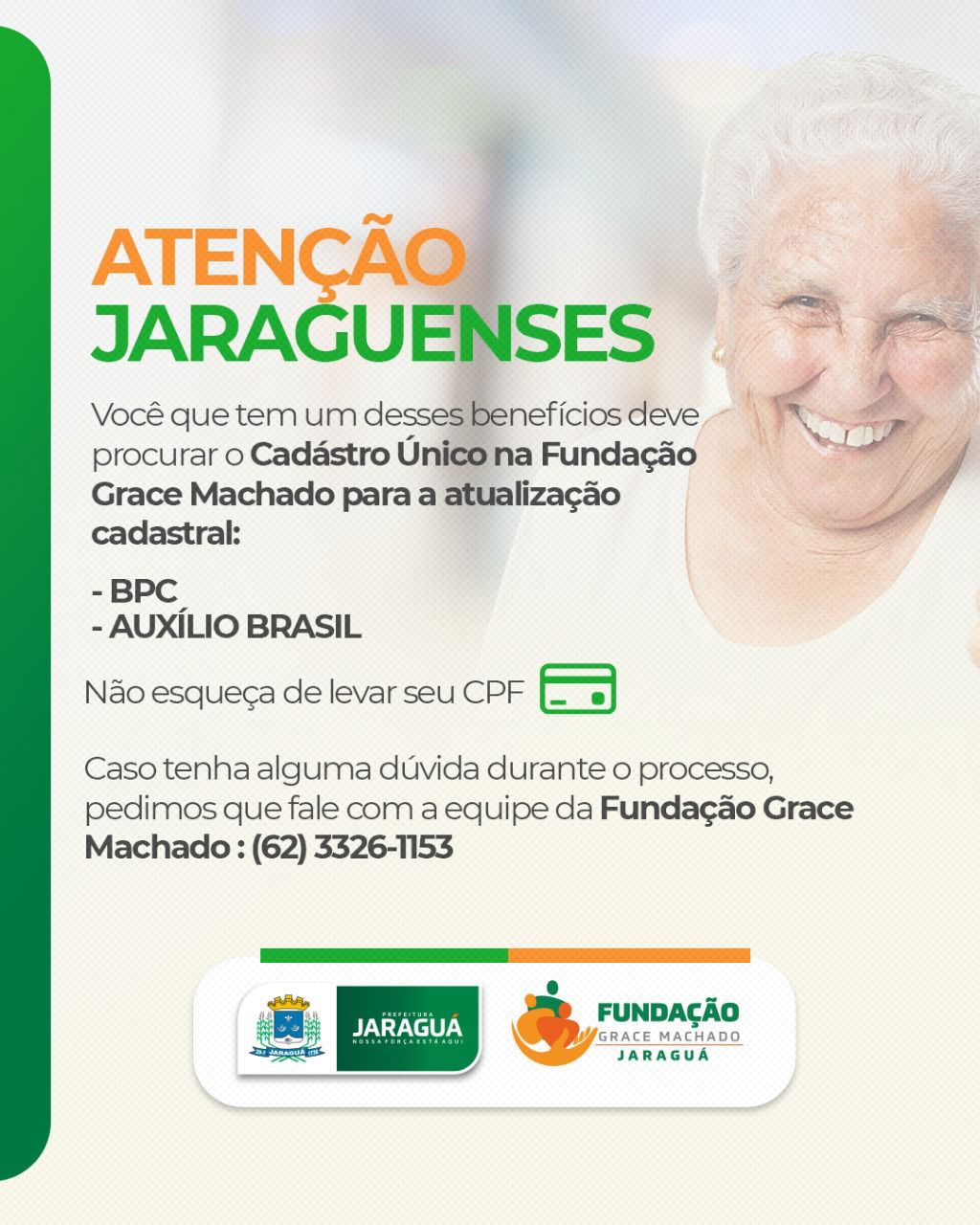 Compareça na sede da Fundação Grace Machado, portando seu CPF, porque neste mês de fevereiro, estaremos realizando a atualização cadastral do BPC e também do Auxílio Brasil. Então não deixe para última hora, evite ter seu benefício bloqueado.