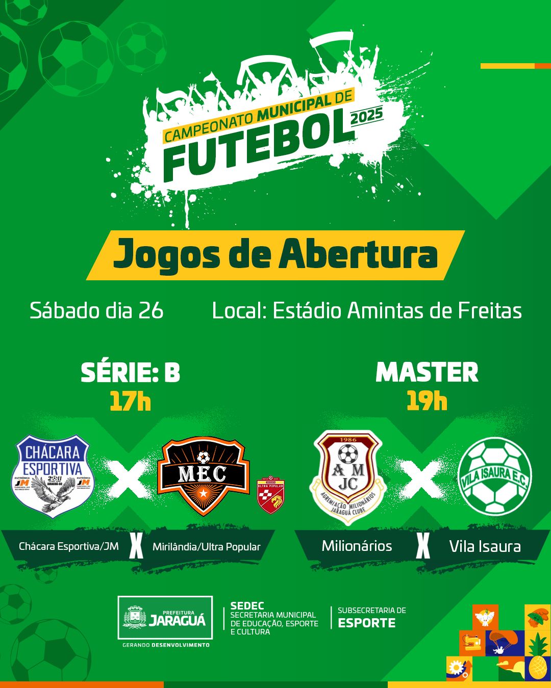 O Campeonato Municipal de Futebol 2025 começa neste sábado, dia 26, no Estádio Amintas de Freitas! Às 17h tem Chácara Esportiva/JM x Mirilândia/Ultra Popular (Série B) e às 19h, Milionários x Vila Isaura (Master).