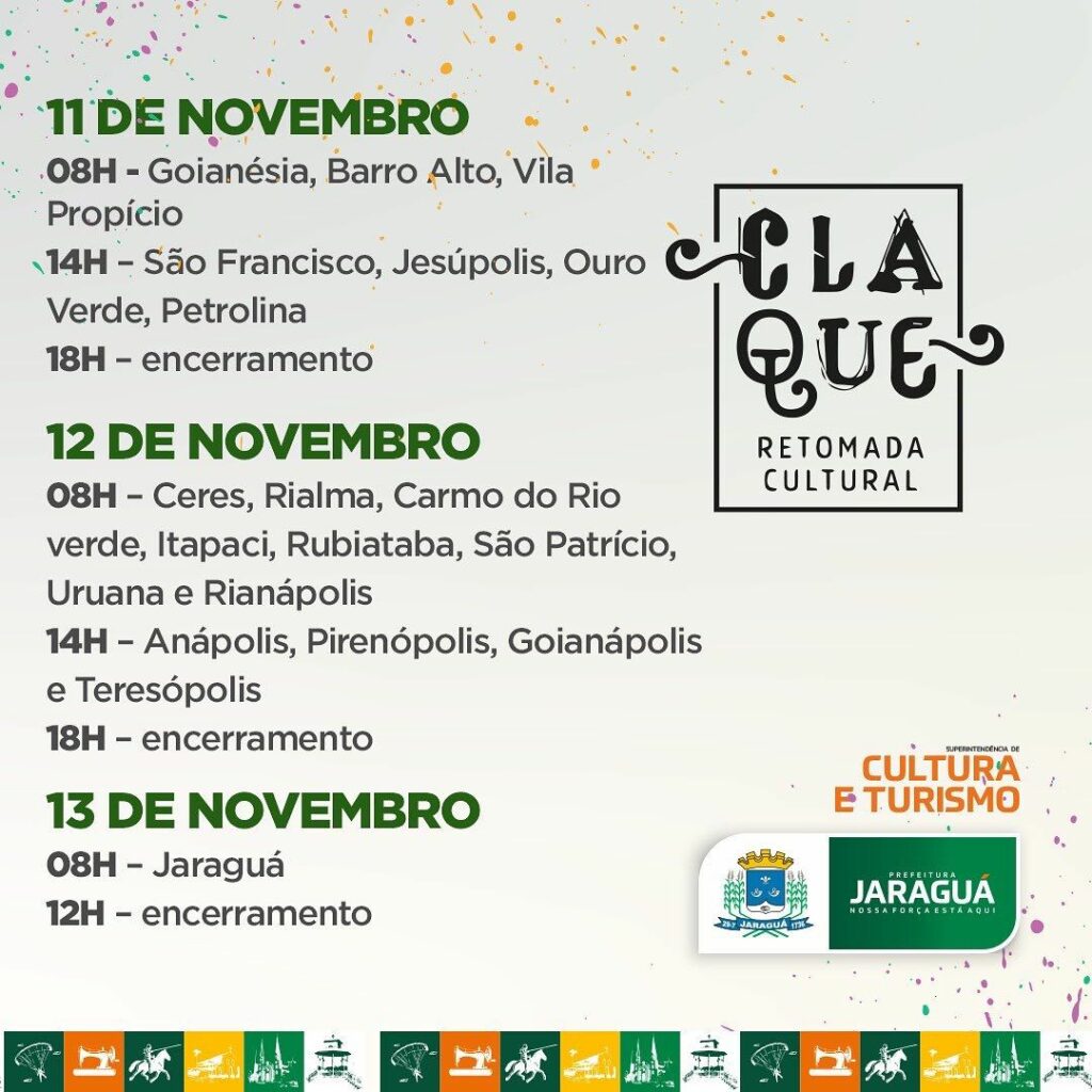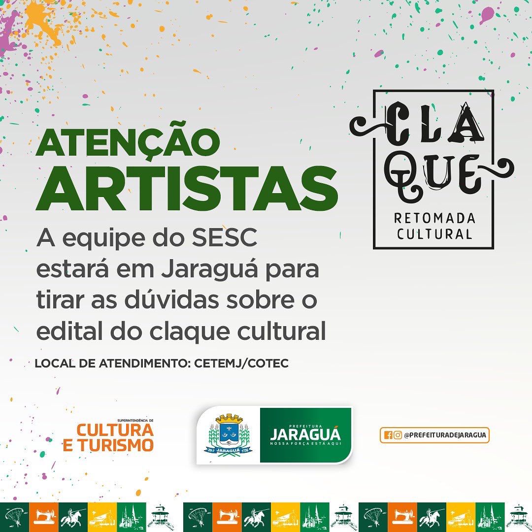 Atenção você artista Jaraguense, nos próximos dias a equipe técnica do @sescgo estará aqui em nossa cidade realizando atendimentos e tirando dúvidas sobre o edital e as inscrições do Claque Cultural. Basta você procurar a sede do CETEMJ/COTEC em horário comercial dentre os dias 10 e 15 de novembro.