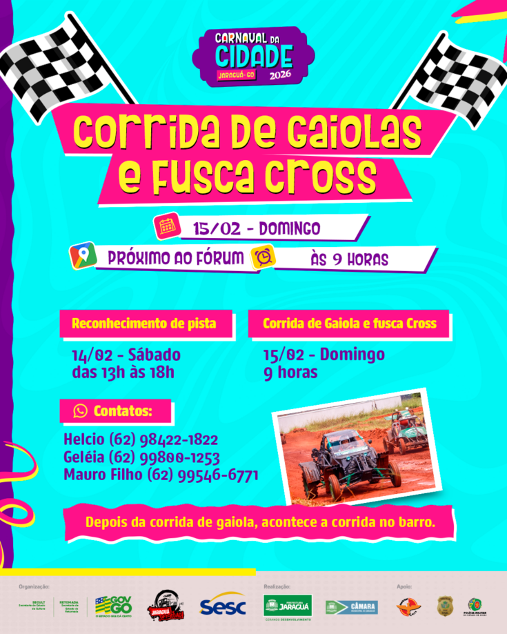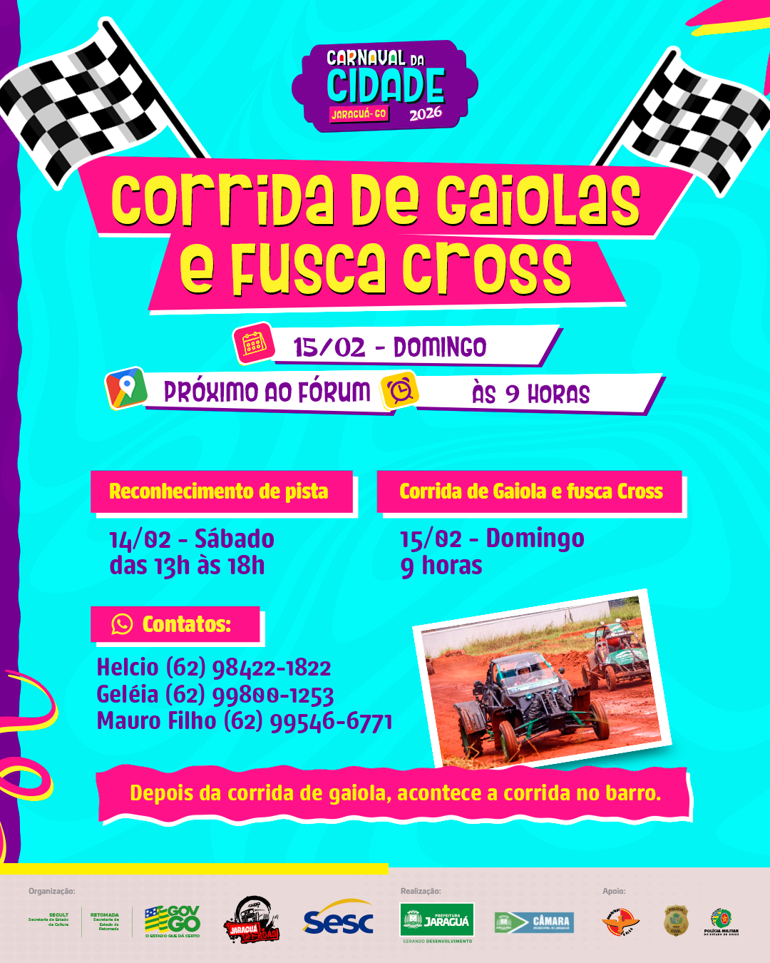 A Prefeitura de Jaraguá convida toda a população para prestigiar a Corrida de Gaiolas e Fusca Cross, que acontece no próximo domingo, (15) de fevereiro, a partir das 9h, em frente ao Fórum, como parte da programação oficial do Carnaval da Cidade 2026.