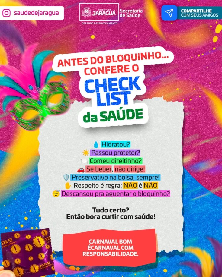 Hidrate-se, use proteção, alimente-se bem, descanse, se beber não dirija e nunca esqueça: respeito é regra — não é não. Pequenas atitudes garantem um Carnaval mais seguro, tranquilo e cheio de bons momentos.