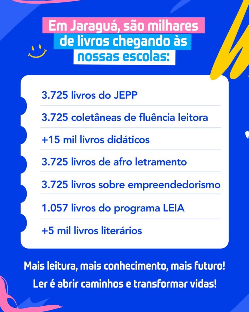 Ler é uma ferramenta essencial para educar, ampliar horizontes e construir o futuro. Em Jaraguá, o compromisso com a educação segue firme, com investimentos que impactam diretamente a vida dos estudantes e de toda a comunidade.