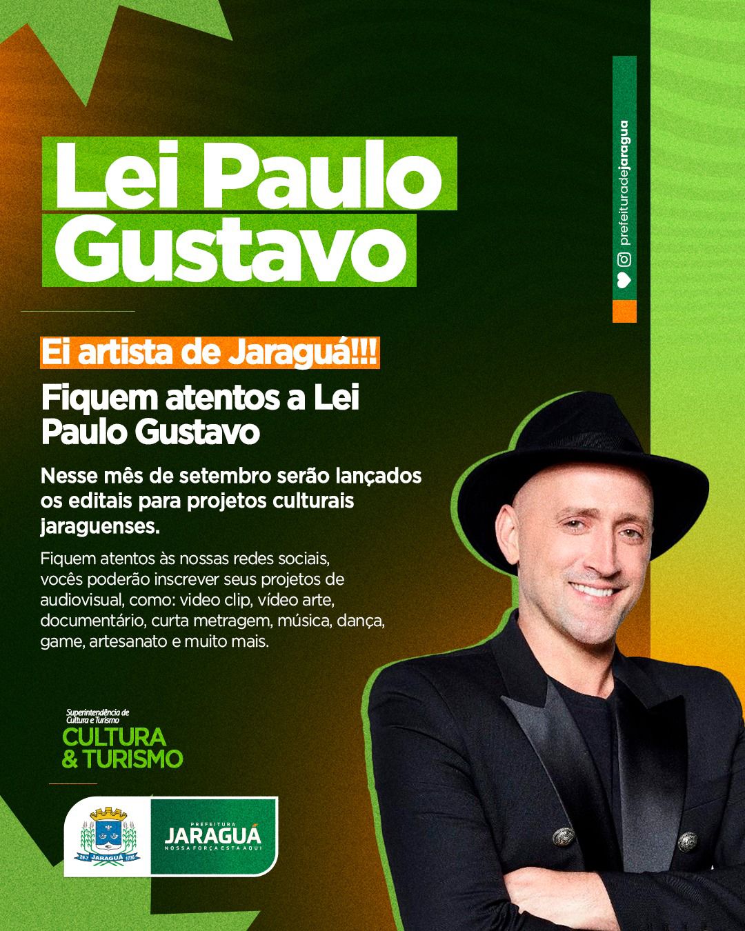 Ei você artista Jaraguense! A Superintendência de Cultura irá lançar neste mês de setembro, o edital de inscrição da Lei Paulo Gustavo de incentivo cultural, voltada a produtores e à classe artística cultural de Goiás.