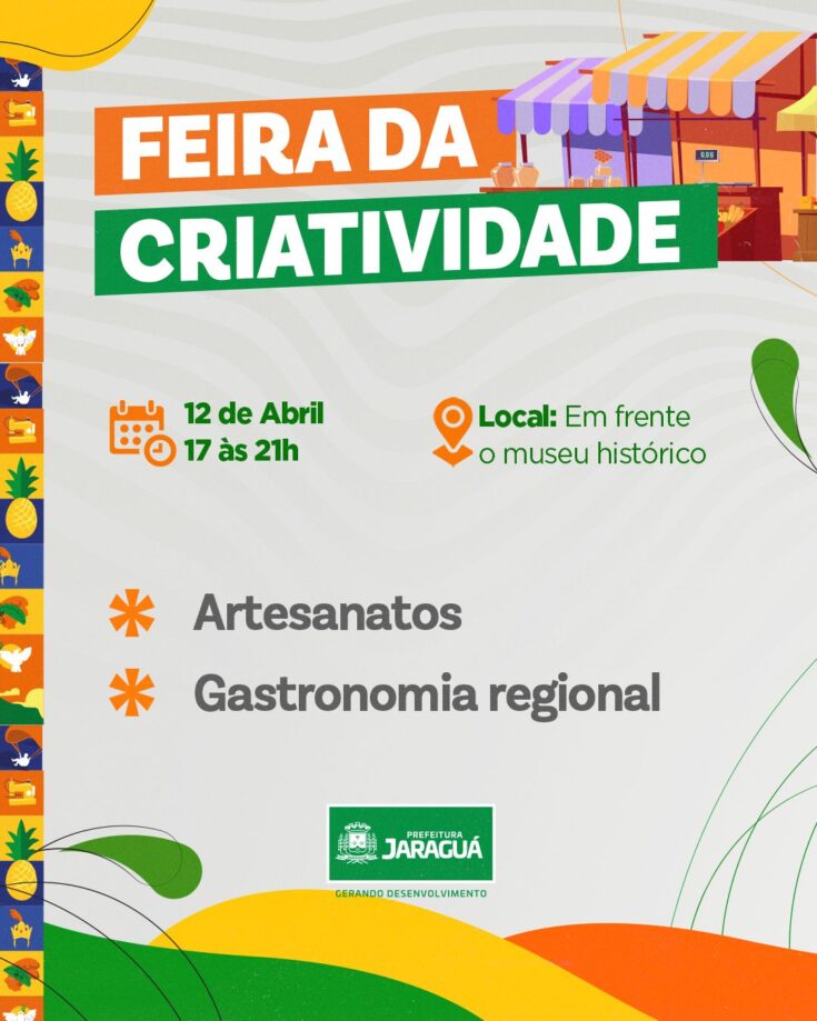 Anota aí! Neste sábado, (12) de abril, das 17h às 21h, tem Feira da Criatividade em frente ao Museu Histórico! Artesanatos, sabores da nossa terra e muita cultura esperando por você.Vem viver essa experiência! 1/1