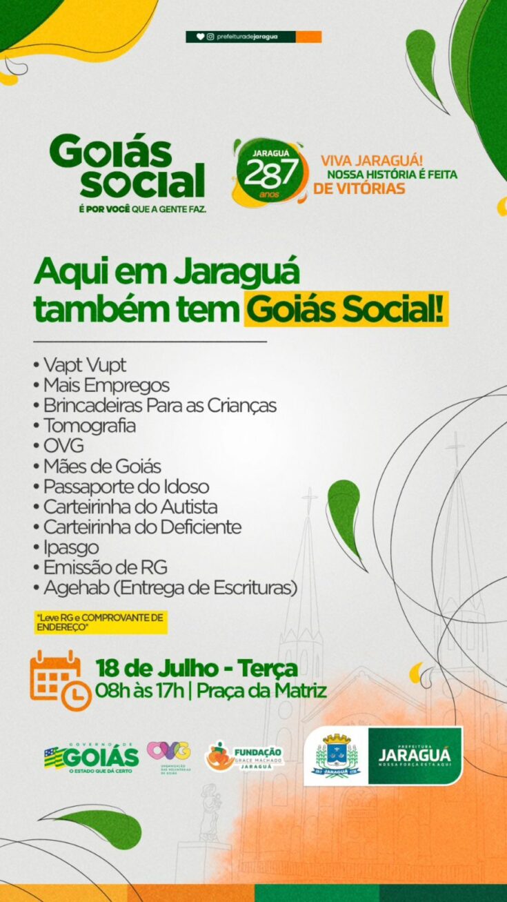 Goiás Social: Celebrando 287 Anos de Jaraguá com benefícios pra nossa gente! Você é nosso convidado para uma edição especial do Programa Goiás Social, em comemoração aos 287 anos de Jaraguá! Um evento imperdível que acontecerá na praça da Igreja Matriz, na próxima terça-feira, dia 18 de julho, a partir das 08h00 da manhã. Um momento único na nossa assistência social com inúmeros benefícios sendo entregues para nossa gente.