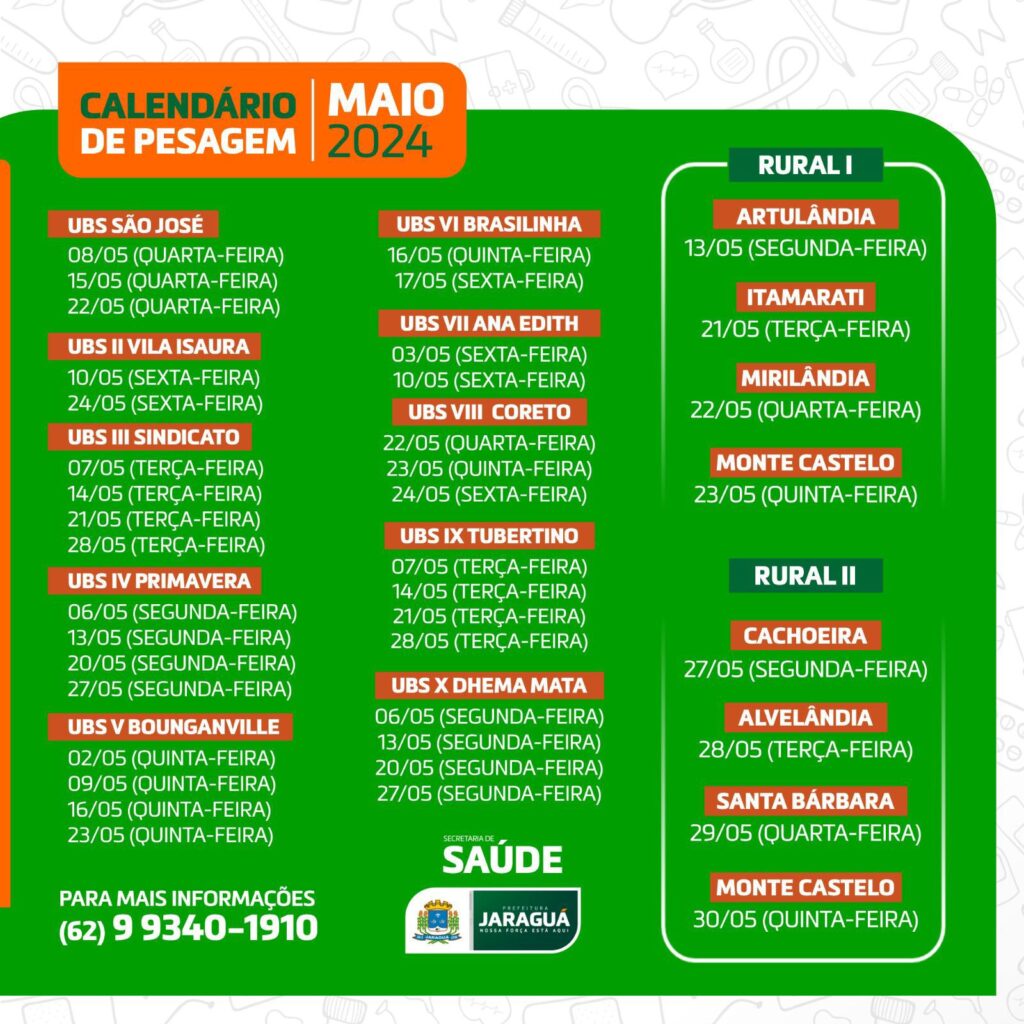 ➡ Fique de olho no calendário! A pesagem obrigatória do Bolsa Família estará ocorrendo das 08h às 11h e das 13h às 16h em todas as Unidades Básicas de Saúde. Evite o bloqueio do seu benefício e compareça à Unidade Básica de Saúde que você está cadastrado(a) para realizar a pesagem. Caso more em área descoberta, procure uma UBS mais próxima de acordo com as datas de pesagem informadas no calendário!