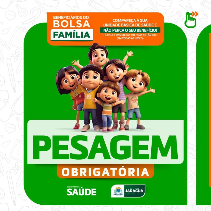 ➡ Fique de olho no calendário! A pesagem obrigatória do Bolsa Família estará ocorrendo das 08h às 11h e das 13h às 16h em todas as Unidades Básicas de Saúde. Evite o bloqueio do seu benefício e compareça à Unidade Básica de Saúde que você está cadastrado(a) para realizar a pesagem. Caso more em área descoberta, procure uma UBS mais próxima de acordo com as datas de pesagem informadas no calendário!
