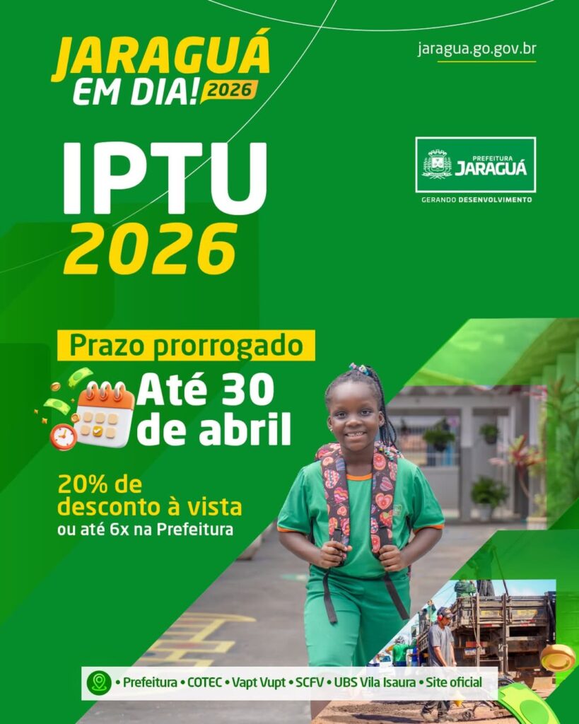Cidade que avança se constrói com compromisso. O IPTU em dia garante mais investimentos, organização e desenvolvimento para Jaraguá. O prazo foi prorrogado! Aproveite até o dia 30 de abril para pagar seu IPTU com desconto e evitar transtornos.
