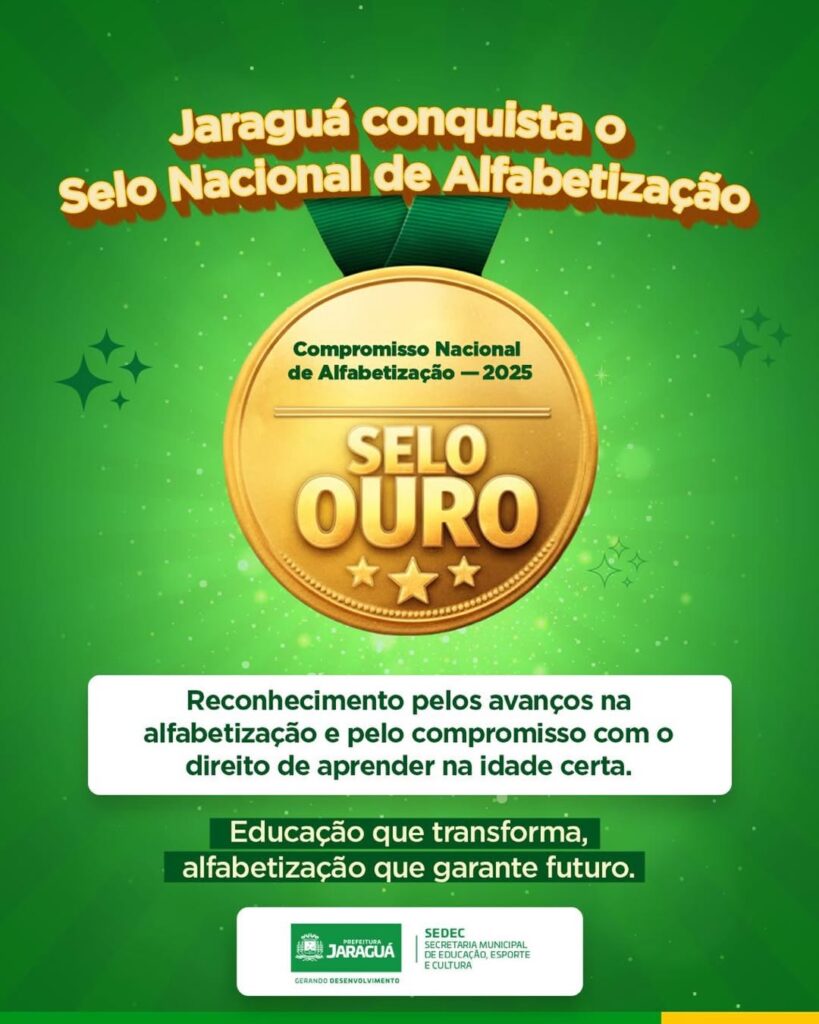 Um reconhecimento que celebra o direito de aprender. Jaraguá conquistou o Selo Nacional de Alfabetização – Categoria Ouro, um dos mais importantes reconhecimentos da educação básica no país, que certifica o compromisso do município com a alfabetização na idade certa. Esse selo reafirma que estamos no caminho certo, com políticas educacionais efetivas, trabalho pedagógico qualificado nas unidades escolares e o esforço coletivo de gestores, coordenadores, professores e de toda a equipe da educação.