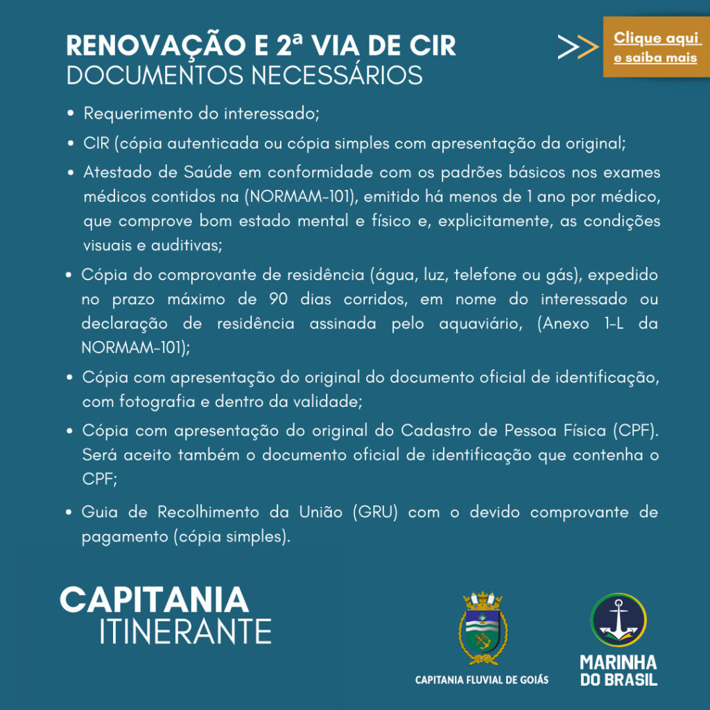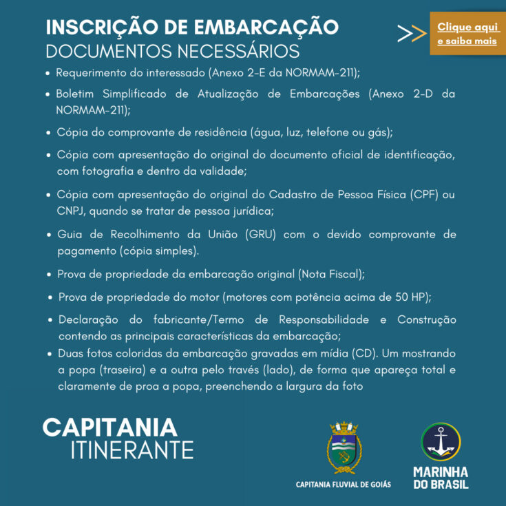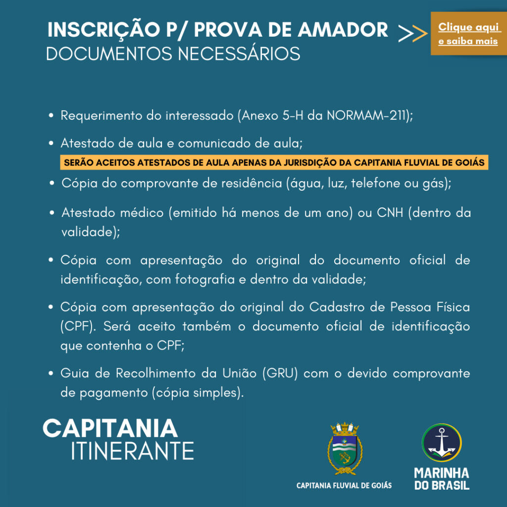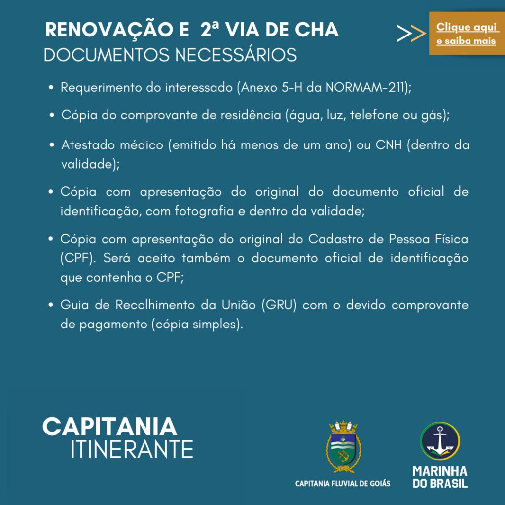 Durante toda a semana, a população poderá resolver serviços ligados à navegação, como renovação e 2ª via de documentos náuticos (CHA, CIR e TIE), inscrição e transferência de propriedade de embarcações, além da aplicação de provas para habilitação de arrais amador.