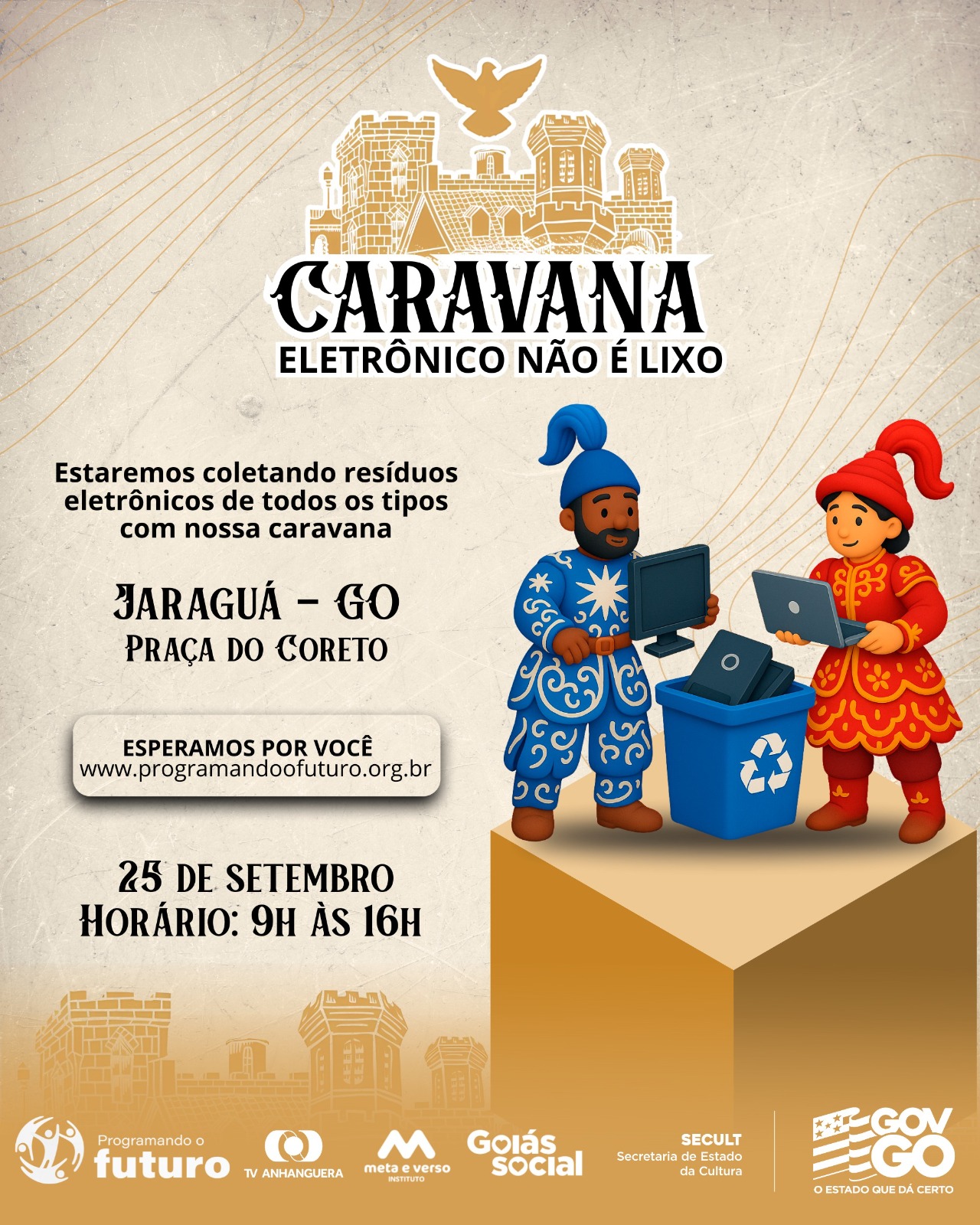 O Governo de Goiás, por meio da Secretaria de Estado da Cultura (Secult), promove a Caravana da Sustentabilidade e da Tecnologia do Circuito das Cavalhadas 2025. A iniciativa arrecada resíduos eletrônicos para recondicionamento e doação a escolas públicas e instituições sociais, unindo sustentabilidade, inclusão digital e fortalecimento cultural.