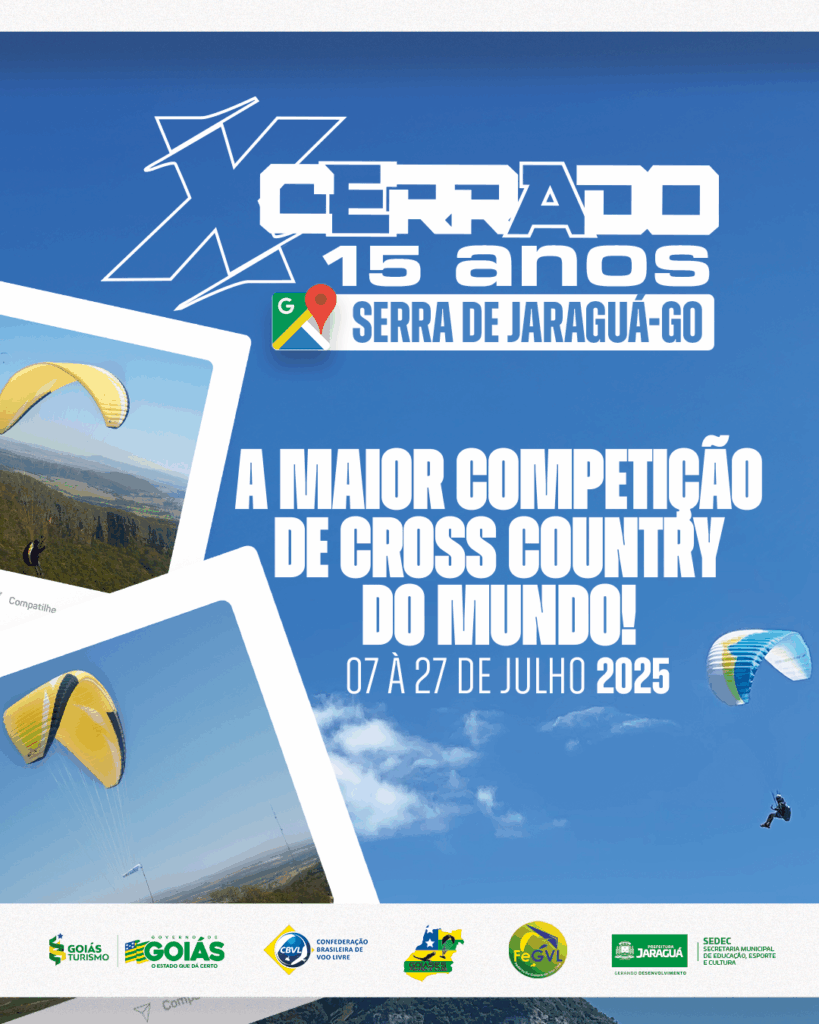 Entre os dias 07 e 27 de julho de 2025, Jaraguá (GO) sedia mais uma edição do XCerrado, a maior competição de Cross Country de voo livre do mundo, que este ano celebra seus 15 anos de história.