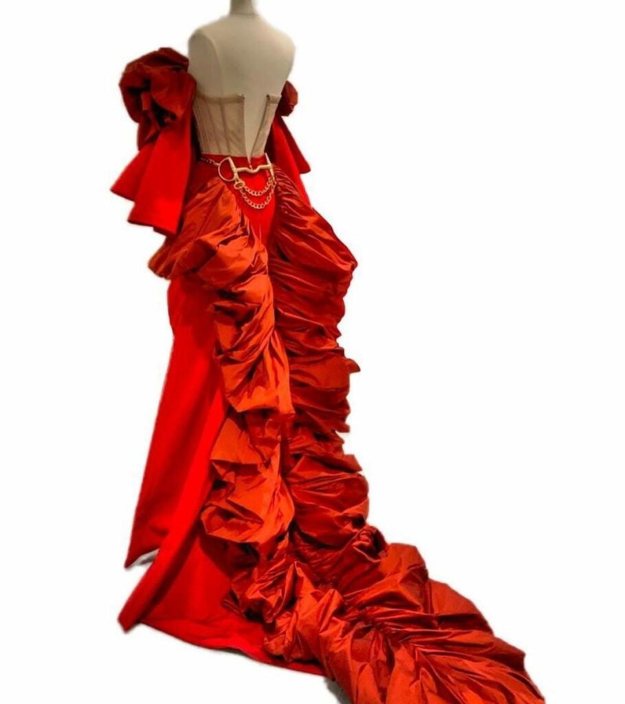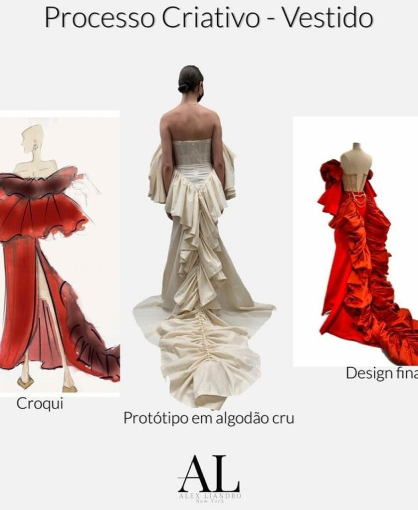 A batalha entre Mouros e Cristãos é representada nas suas roupas por elementos que remetem aos cavalos, armaduras e, claro, o sangue derramado. Assim como as nossas Cavalhadas, as criações de Alex Liandro transformam um tema tão profundo e sangrento em beleza, não para apagar o sofrimento da época, mas para ressaltar que a arte é capaz de fazer lembrar, criticar, ressignificar e transformar em beleza qualquer eventualidade humana.