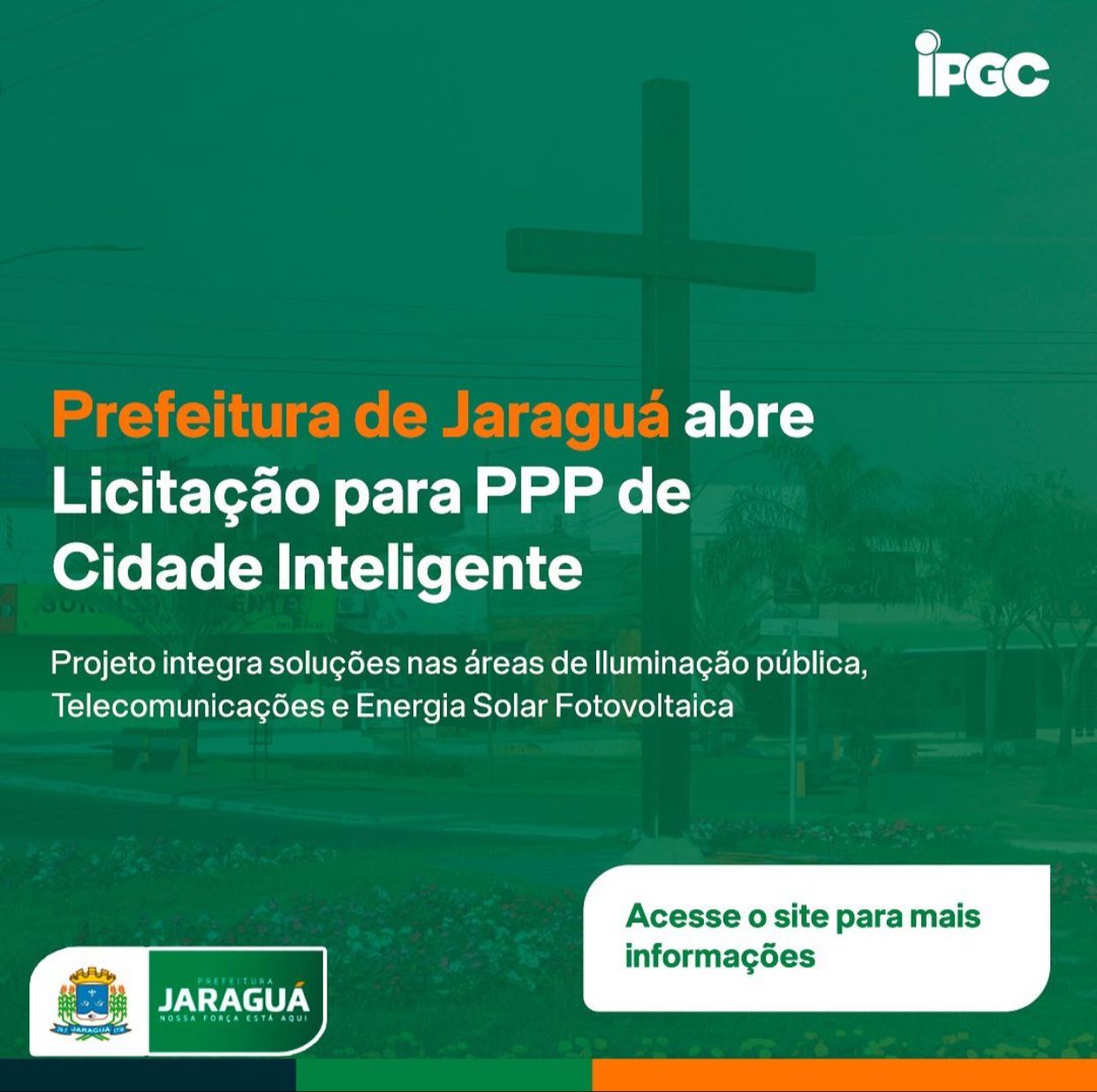 A Prefeitura de Jaraguá comunica que está aberta a Licitação para contratação de Parceria Público–Privada (PPP), na modalidade de Concessão Administrativa dos Serviços de Eficientização, Operação e Manutenção da Iluminação Pública, Infraestrutura de Telecomunicações e Usina Fotovoltaica própria.