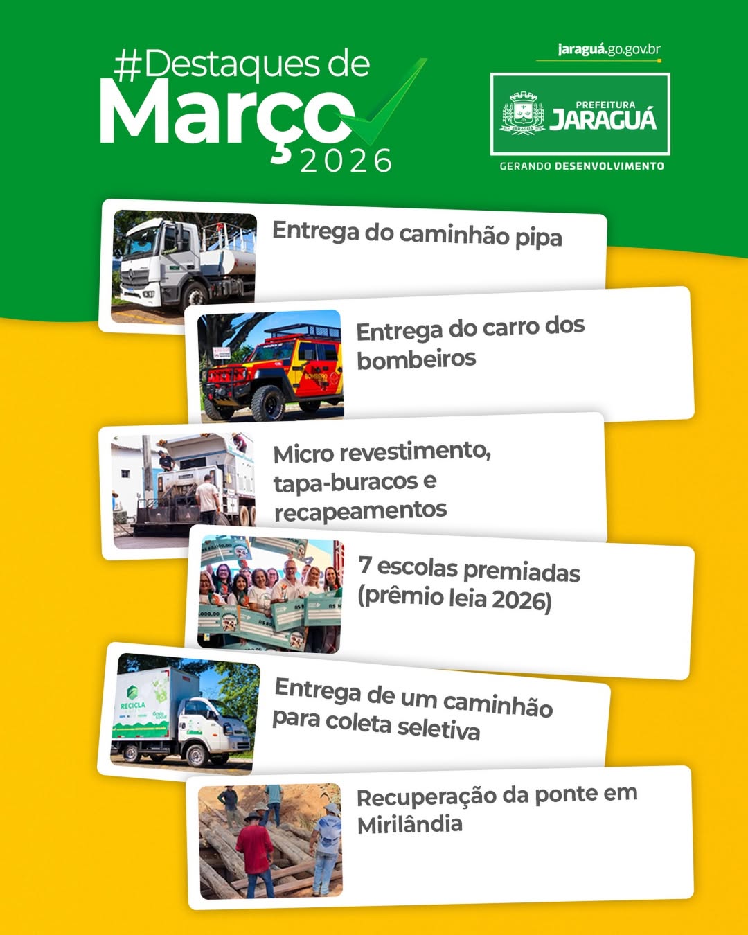 Março foi de muito trabalho em Jaraguá! Entrega de veículos, avanços na infraestrutura com tapa-buracos e recapeamentos, 7 escolas premiadas, reforço na coleta seletiva e melhorias na zona rural. Seguimos construindo uma cidade que avança todos os dias!