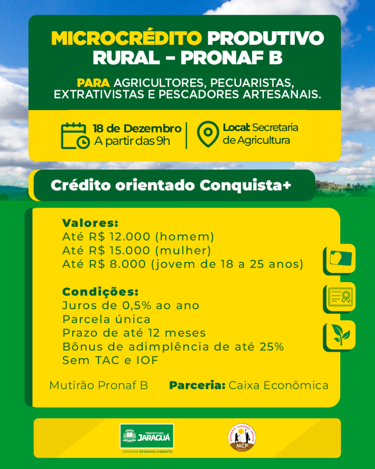 A Prefeitura de Jaraguá convida agricultores, pecuaristas, extrativistas e pescadores artesanais para participar do Mutirão do Microcrédito Produtivo Rural – PRONAF B, uma oportunidade de acesso a crédito orientado para fortalecer a produção e gerar mais desenvolvimento no campo.