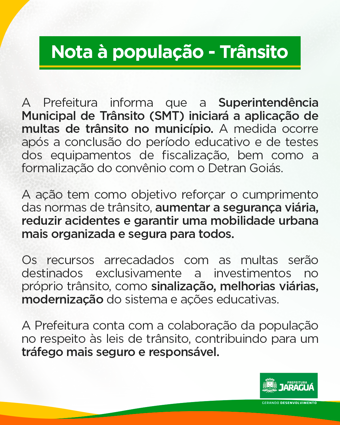 A Prefeitura de Jaraguá informa que a Superintendência Municipal de Trânsito (SMT) iniciará a aplicação de multas no município. A medida passa a valer após o período educativo, testes dos equipamentos e a formalização do convênio com o Detran Goiás.