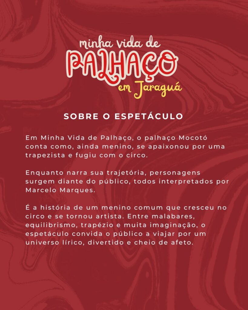 O espetáculo Minha Vida de Palhaço conta a história de Mocotó, um menino que foge com o circo e descobre, entre trapézios, malabares e mestres palhaços, o verdadeiro significado de ser artista. Em cena, Marcelo Marques interpreta todos os personagens, levando ao público uma história leve, divertida e cheia de imaginação.