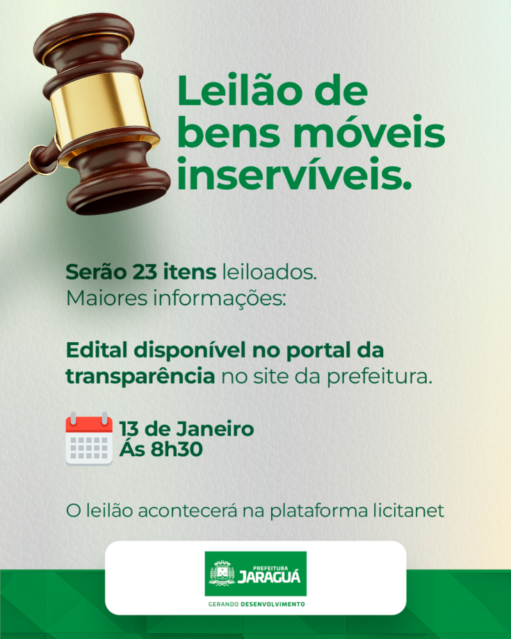 Participe do leilão de bens móveis inservíveis. Serão leiloados 23 itens, conforme edital disponível no Portal da Transparência.