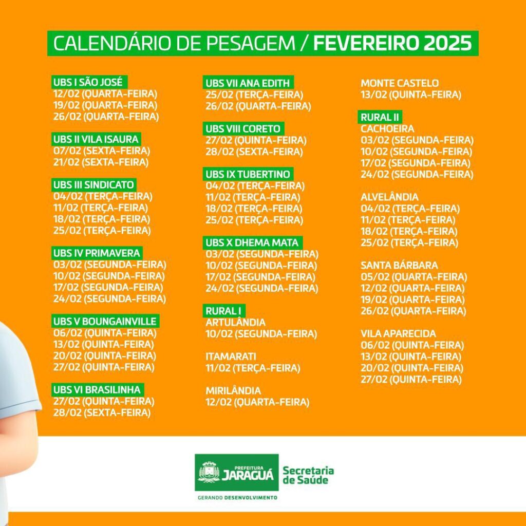 ➡ Fique de olho no calendário! A pesagem obrigatória do Bolsa Família estará ocorrendo das 08h às 11h e das 13h às 16h em todas as Unidades Básicas de Saúde. Evite o bloqueio do seu benefício e compareça à Unidade Básica de Saúde que você está cadastrado(a) para realizar a pesagem. Caso more em área descoberta, procure uma UBS mais próxima de acordo com as datas de pesagem informadas no calendário!