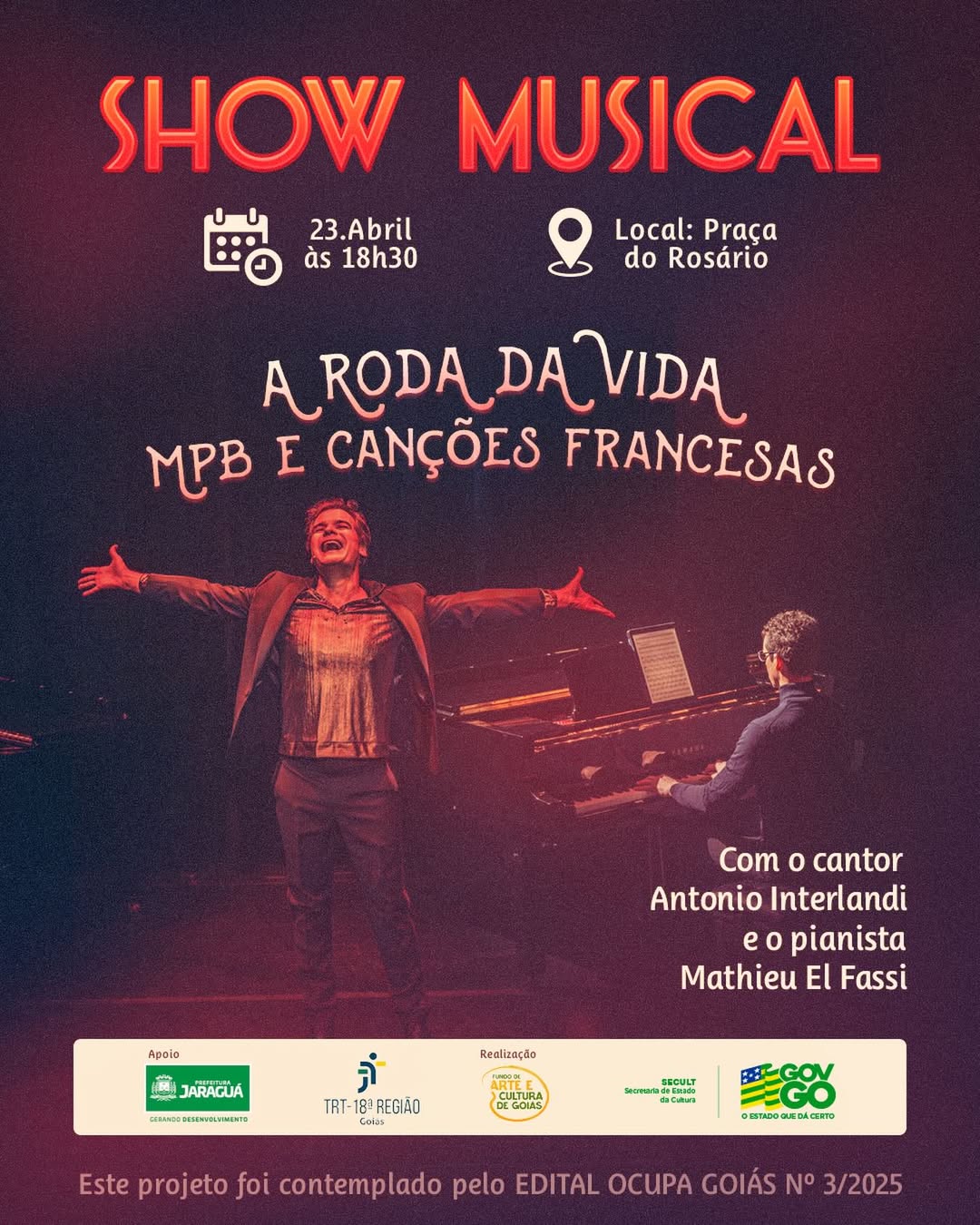 Jaraguá recebe uma apresentação musical especial na Praça do Rosário, reunindo o artista jaraguense de carreira internacional Antonio de Freitas Interlandi e o pianista francês Mathieu Elfassi. O público poderá apreciar um repertório que passeia pela MPB e por canções francesas, em uma apresentação para piano e voz.