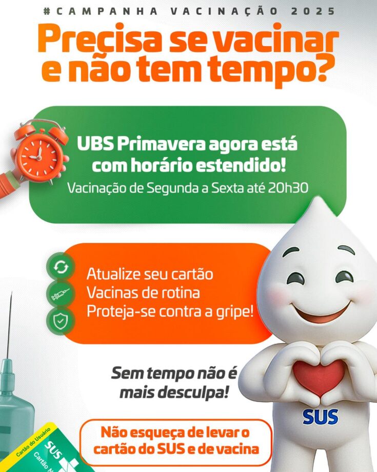 Vacinação vai até às 20h30 — dá tempo de sair do trabalho, tomar um café e ainda garantir sua proteção!