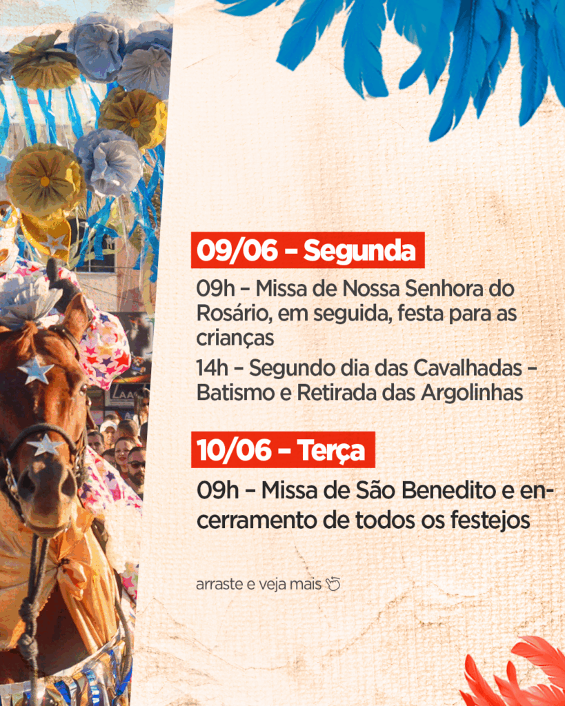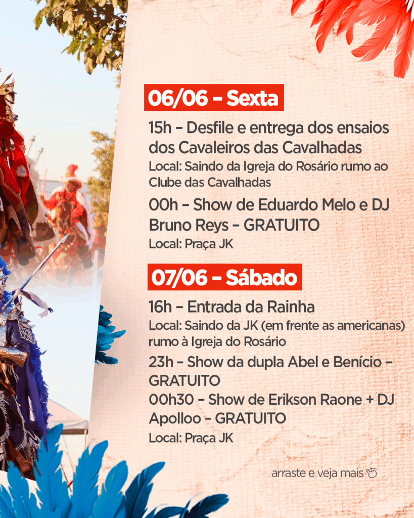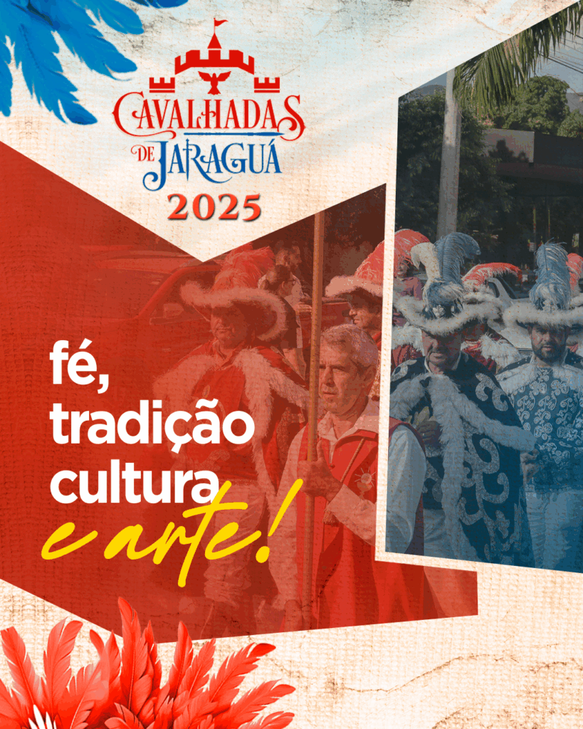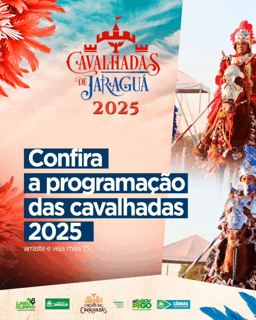 Está oficialmente divulgada a programação das Cavalhadas de Jaraguá 2025! Prepare-se para dias de fé, tradição e muita festa. Arraste e confira os detalhes! 1/5
