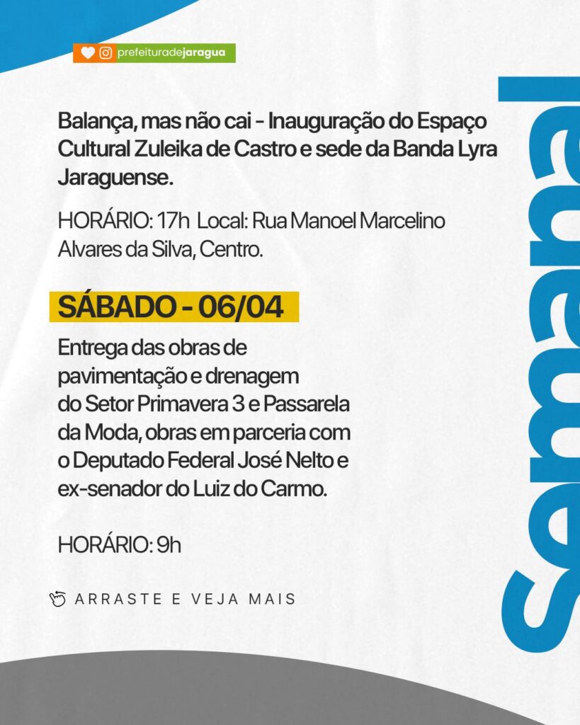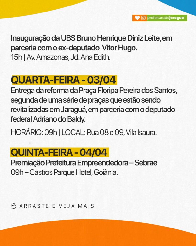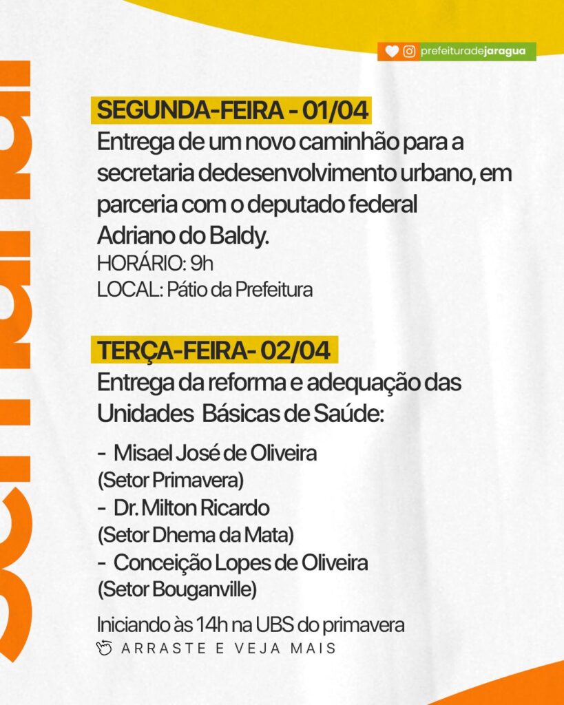 🙏🏻🤩 Mês de abril começou, e com ele vamos para mais 30 dias de entrega e muito trabalho, em especial, os próximos dias terão muitas coisas boas, com inaugurações, entregas e muito mais que você confere na arte. Vem com a gente ver como Jaraguá é a uma cidade que cresce! 📲✅