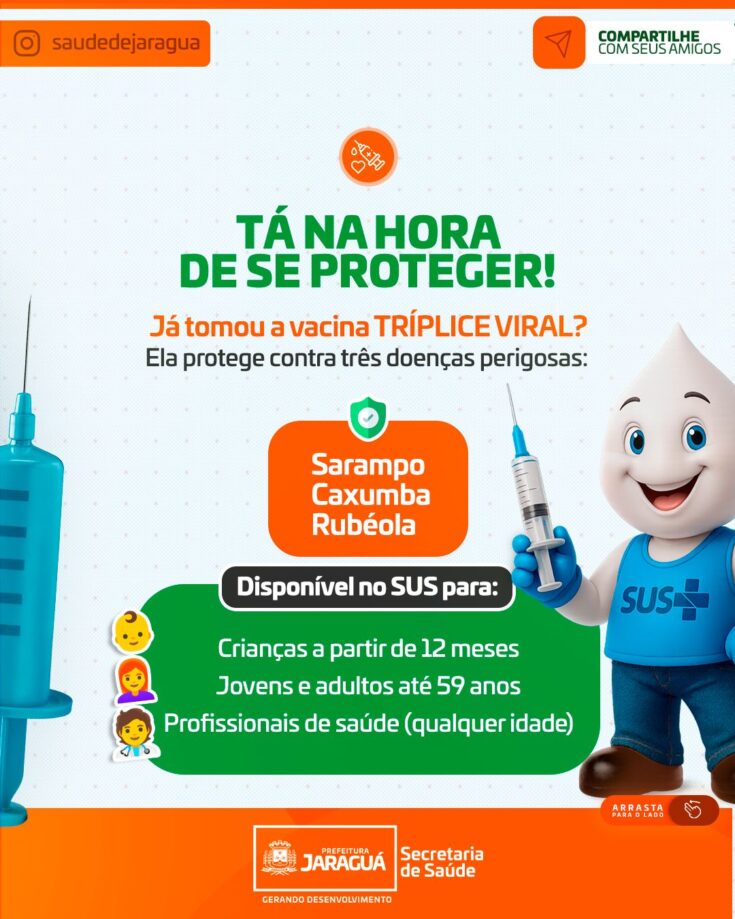 Caxumba, sarampo e rubéola? Aqui não! A vacina tríplice viral protege contra essas três doenças de uma vez só — e o melhor: é gratuita e está disponível nas nossas unidades de saúde!