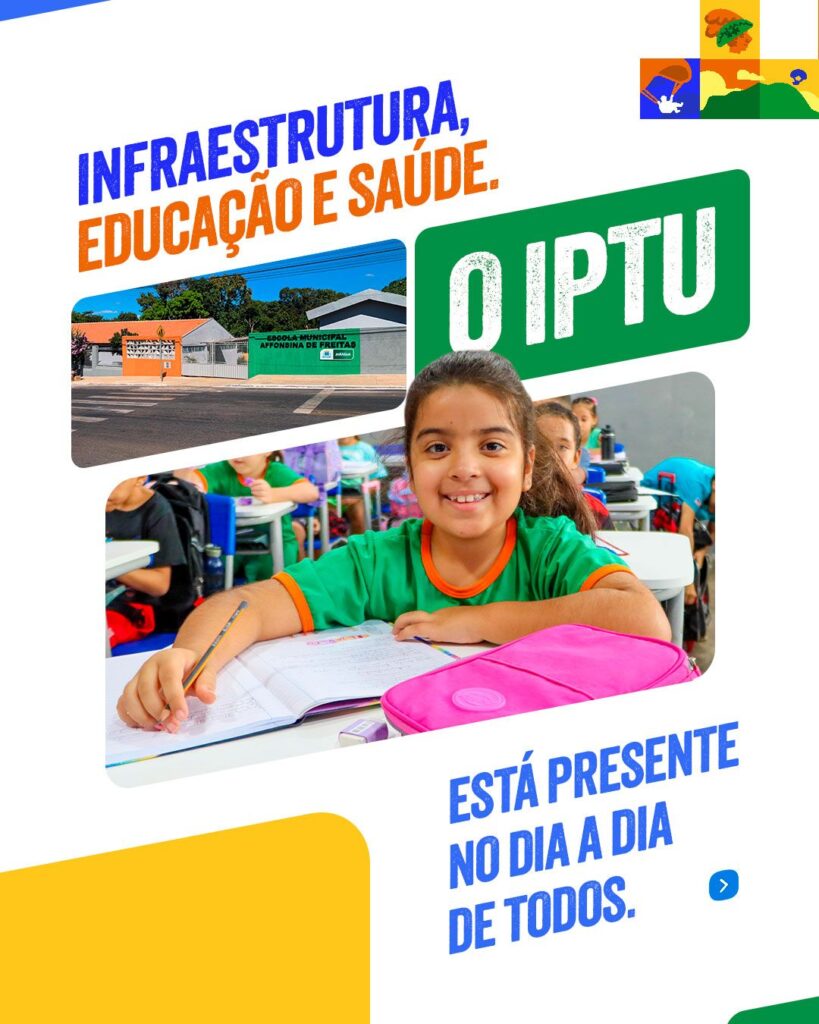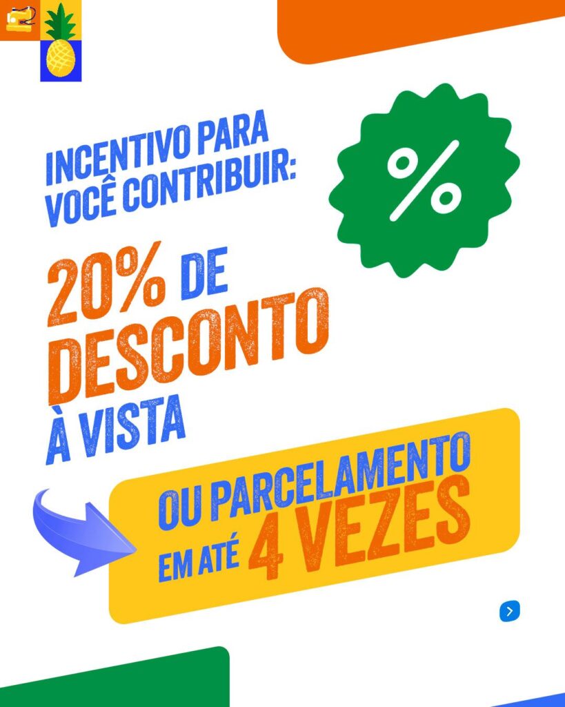 Aproveite 20% de desconto para pagamento à vista ou parcele em até 4x. Retire seu IPTU até 31 de março no site da prefeitura, no Vapt Vupt, na Camara Municipal e na sede do Cotec ou no Palácio do Sol. Pague em dia e ajude no desenvolvimento da nossa cidade.