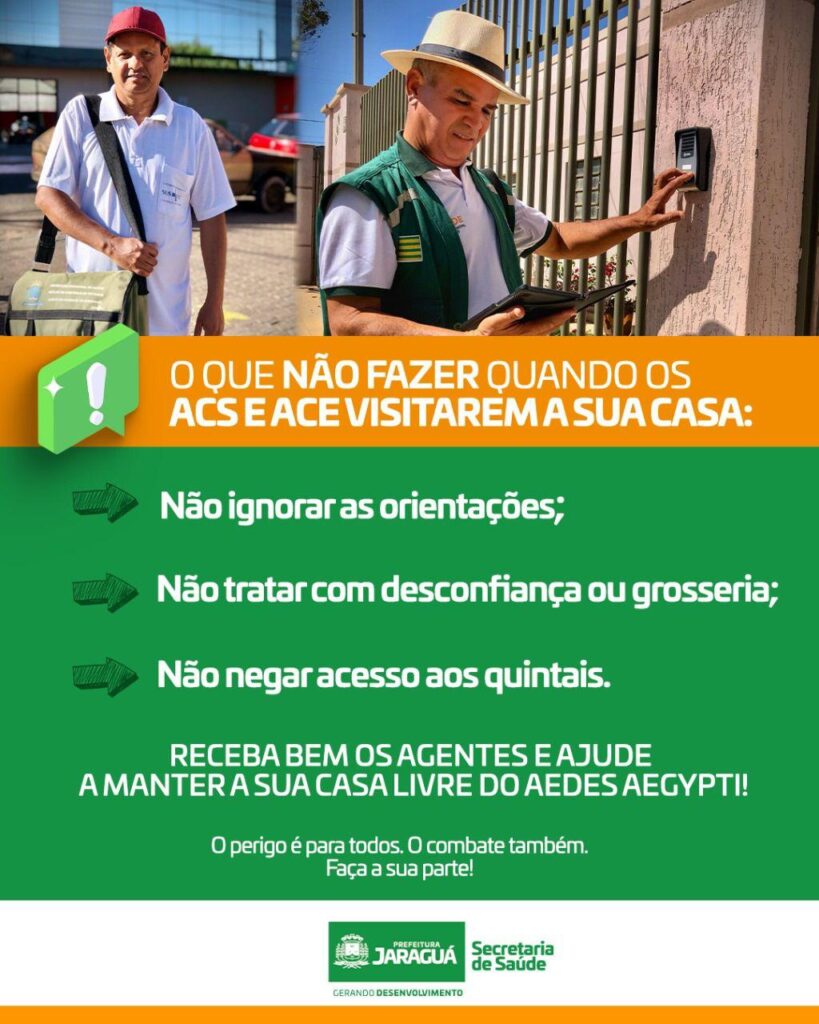 📌 Uma dessas ações é receber o Agente Comunitário de Saúde (ACS) e o Agente Combate de Endemias (ACE) para realizar a inspeção da sua casa! Não negue o acesso ao seu quintal, receba bem os Agentes e não ignore as orientações de combate à dengue!