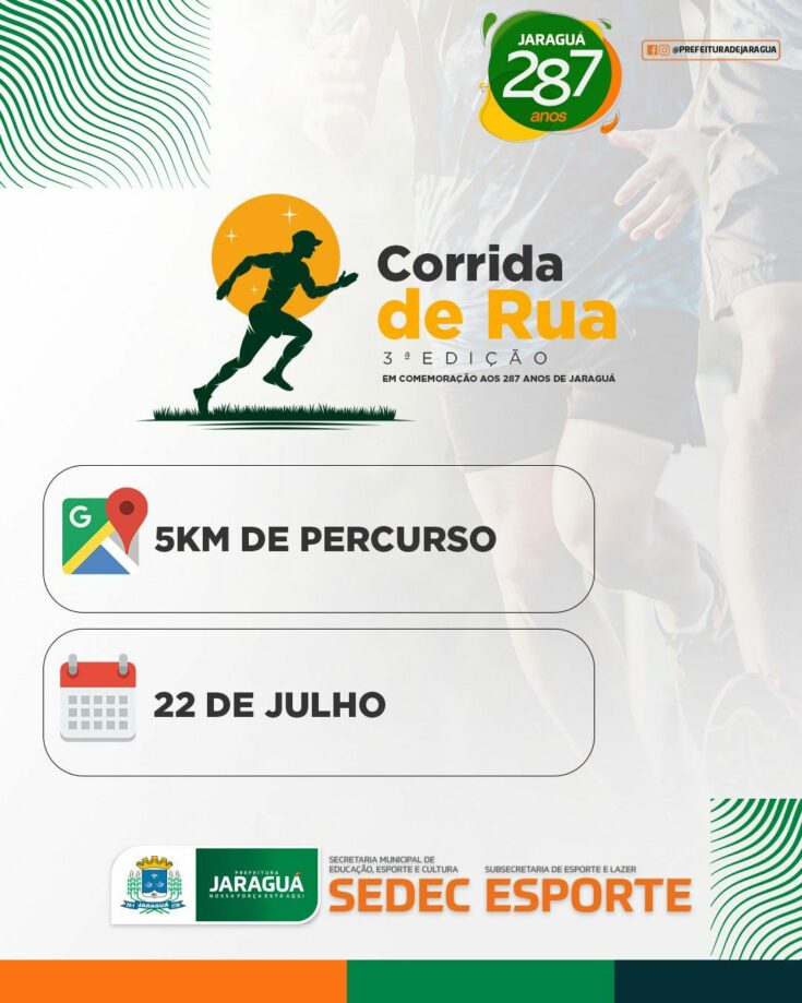 Tá sabendo da novidade?! Por mais um ano consecutivo vamos realizar a tradicional Corrida de Rua em comemoração aos 287 anos de Jaraguá. Então já marca na sua agenda de treinos e vai se preparando para participar com a gente dessa grande competição, que virou referência em nosso calendário esportivo anual.