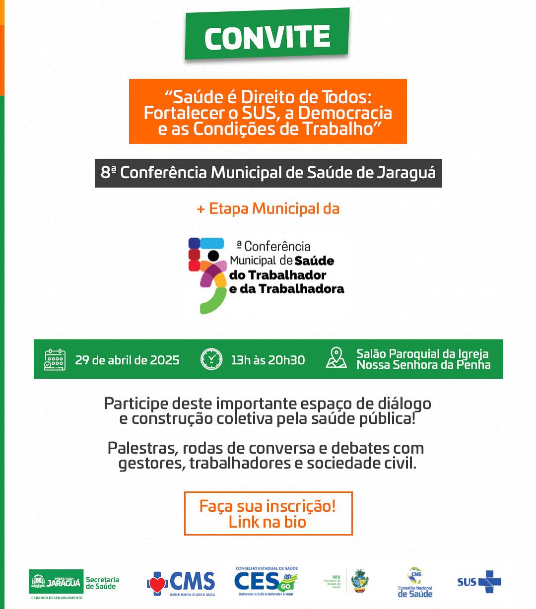 A 8ª Conferência Municipal de Saúde de Jaraguá e a Etapa Municipal da 5ª Conferência Nacional de Saúde do Trabalhador e da Trabalhadora estão chegando, e você é nosso convidado(a) especial para construir esse futuro com a gente!